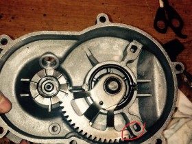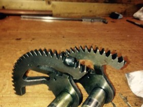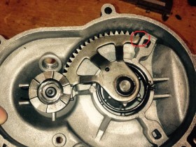 Man tritt von der anderen Seite auf den Kickstarterhebel der an der Welle des Zahnkranzes befestigt ist und durch die Schrägverzahnung fährt der kleine Anlasser aus, trifft auf das Gegenstück welches an der Kupplung befestigt ist und das Bike springt (hoffentlich) an. So weit so gut. Mir ist aber aufgefallen, dass bei dem alten Zahnkranz die vorletzten Zähne verschweißt wurden (Bild)