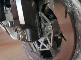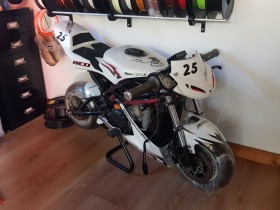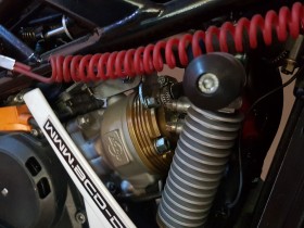Vorne und hinten Hackmesser Bremsscheiben schwimmend, Drehzahlmesser mit Temperatur und natürlich der B1 Rahmen mit Kurzhub Gasgriff, Kunststoff Starter, Polrad mit Zahnriemen für Wasserpumpe.
