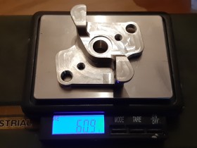 Dann hatte ich ja auch noch selbstgefräste Kupplungsbacken aus 7075 im PF style rumliegen - und zu allem Elend bin ich in meinem Materiallager über eine Stange Titan gestolpert. Wäre doch schön die selbstgefrästen Kupplungsbacken auf eine (schön leichte) selbstgefertigte Grundplatte stecken zu können. Also wurde die Grundplatte aus Titan angefertigt. Selbige ist nun 40g leichter als die Seriengrundplatte.